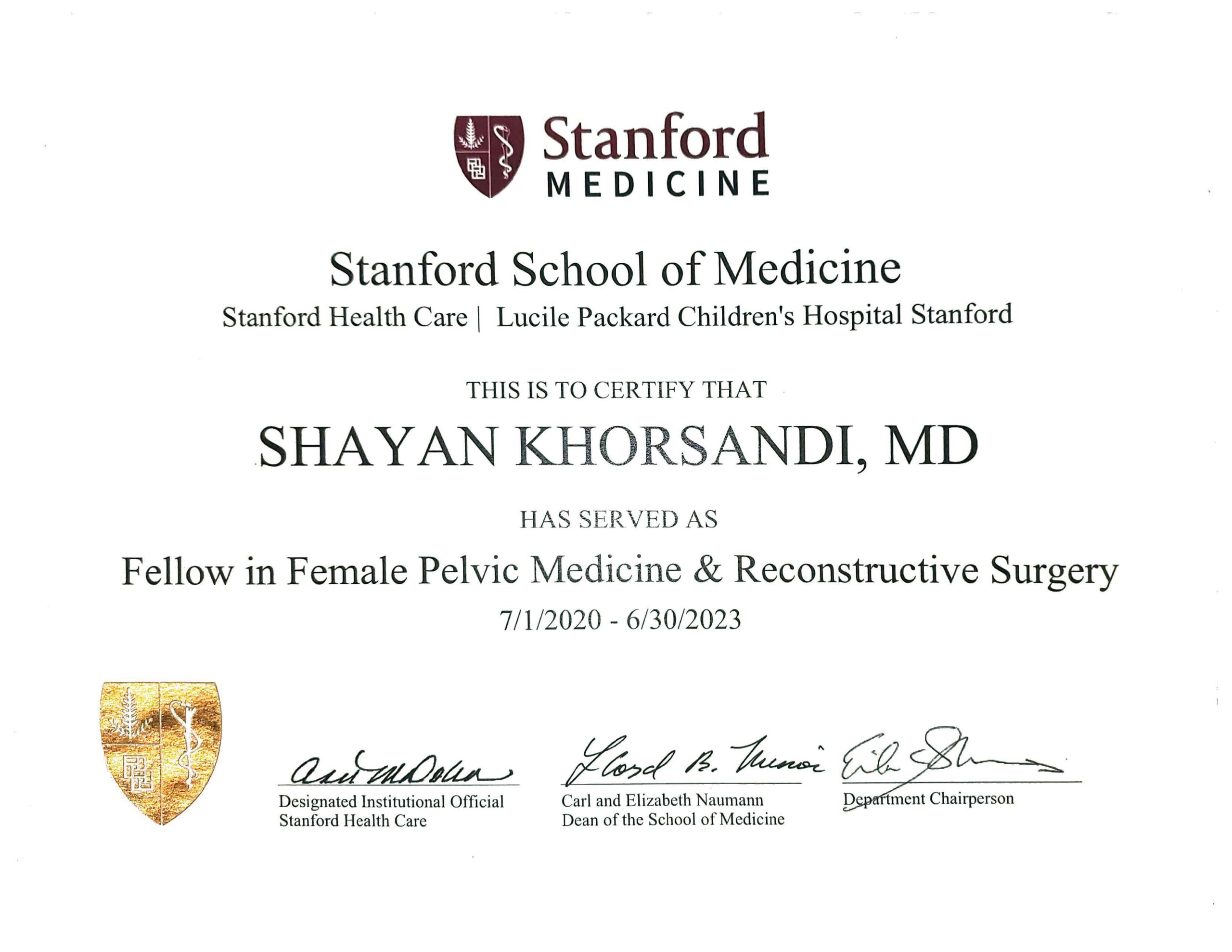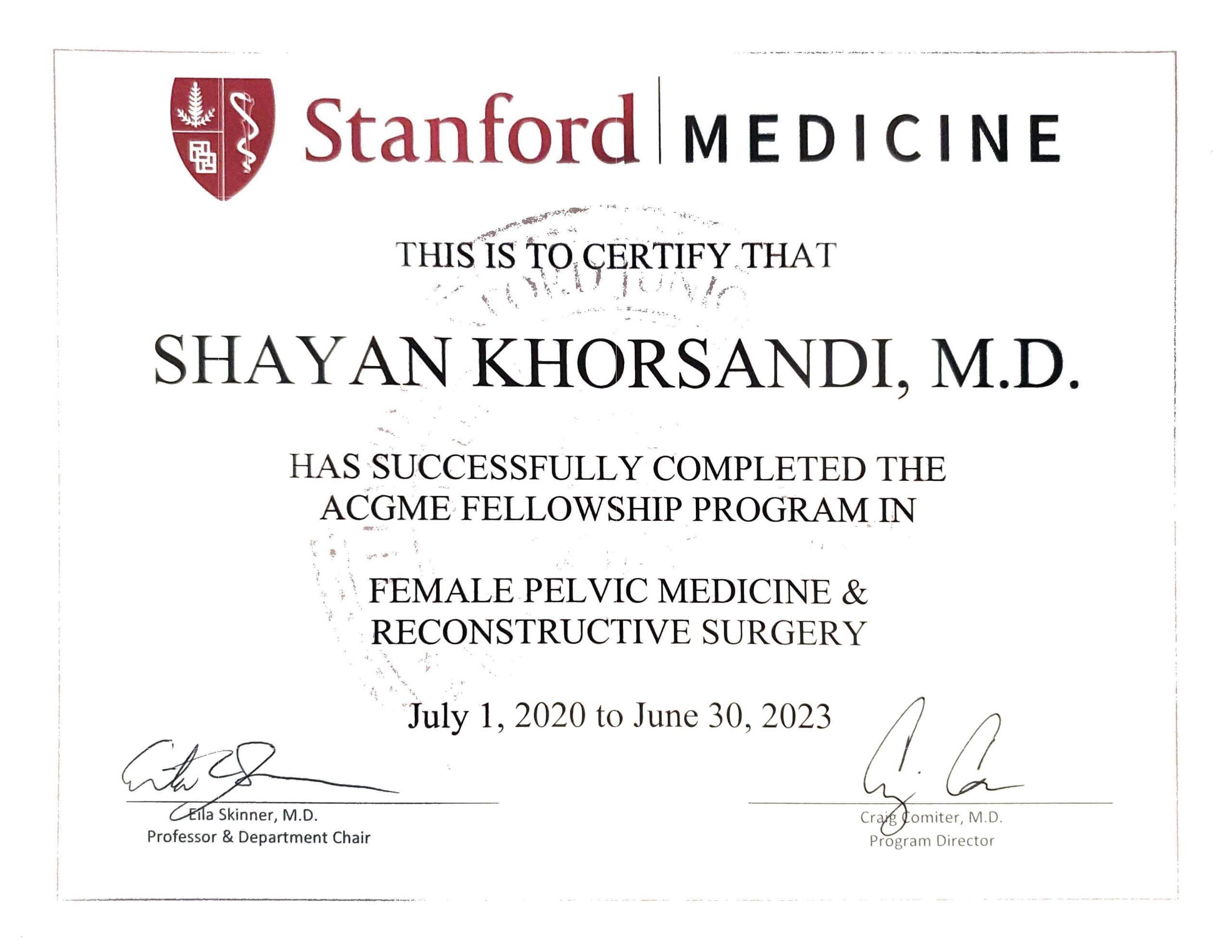 El Dr. Khorsandi Rodríguez ejerció como ginecólogo-obstetra en Alliance OBGyn durante varios años, perfeccionando sus habilidades cirugía robótica ginecológica y construyendo relaciones de confianza con sus pacientes. Sin embargo, su pasión por el avance en el tratamiento de trastornos del suelo pélvico lo llevó a especializarse aún más, completando el Fellowship en Uroginecología en la Stanford University Hospital en California. Allí, se enfocó en el manejo y tratamiento avanzado de trastornos del suelo pélvico y la incontinencia urinaria, destacándose por su enfoque innovador y su habilidad clínica.
